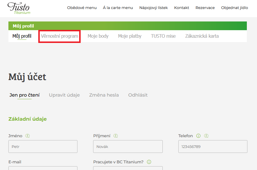 Pro vstup na hlavní stránku věrnostního programu, použijte tlačítko "věrnostní program" v horní liště.